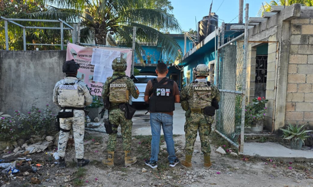 La Fiscalía General del Estado informa que, en cumplimiento de cuatro órdenes de cateo giradas por jueces de control, en los municipios de Benito Juárez, Playa del Carmen y Othón P. Blanco, aseguró, en coordinación con elementos de la Secretaría de la Defensa Nacional, Guardia Nacional y Secretaría de Marina, cuatro inmuebles, así como sustancias similares a drogas.