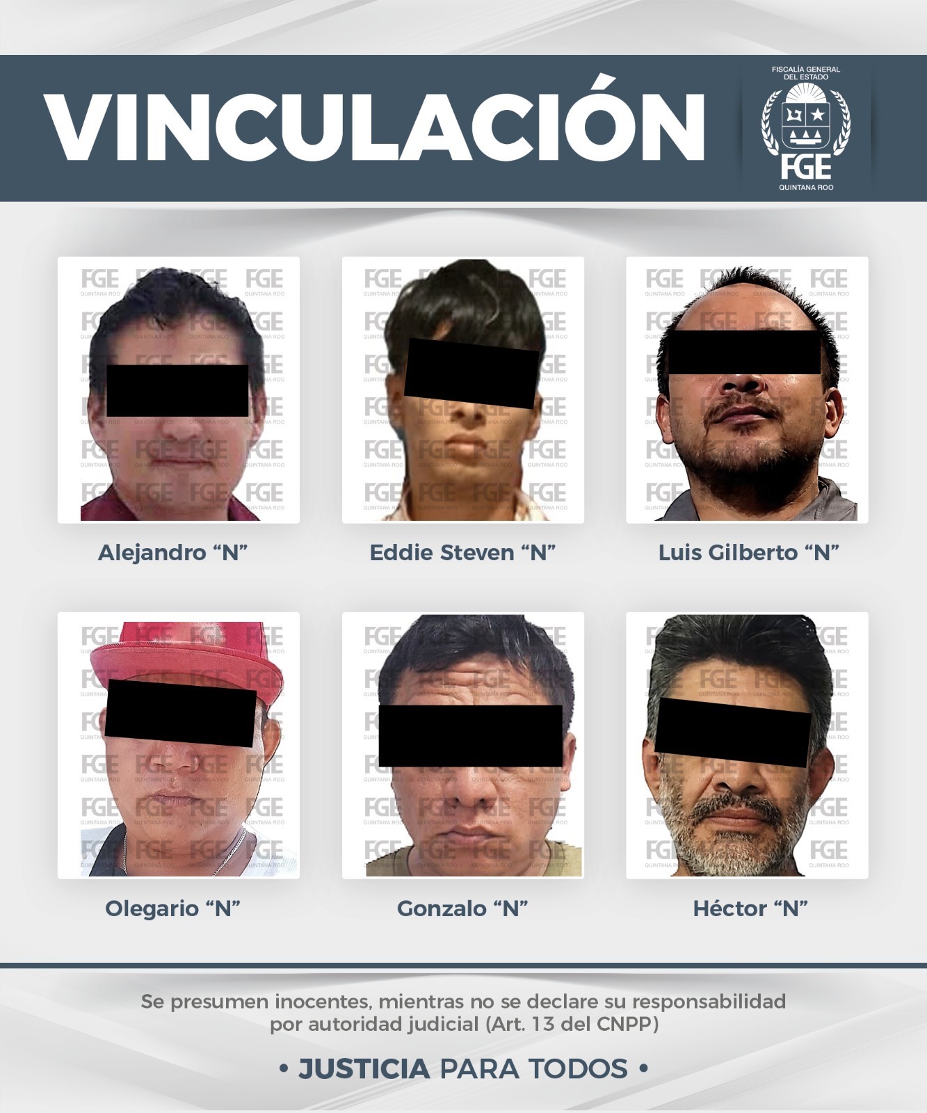 Por su probable participación en hechos posiblemente constitutivos del delito de violencia familiar, la Fiscalía General del Estado obtuvo, por separado, de jueces de control, la vinculación a proceso de siete personas y cumplimentó orden de aprehensión para un sujeto más, en los municipios de Benito Juárez, Playa del Carmen, Felipe Carrillo Puerto y Othón P. Blanco.