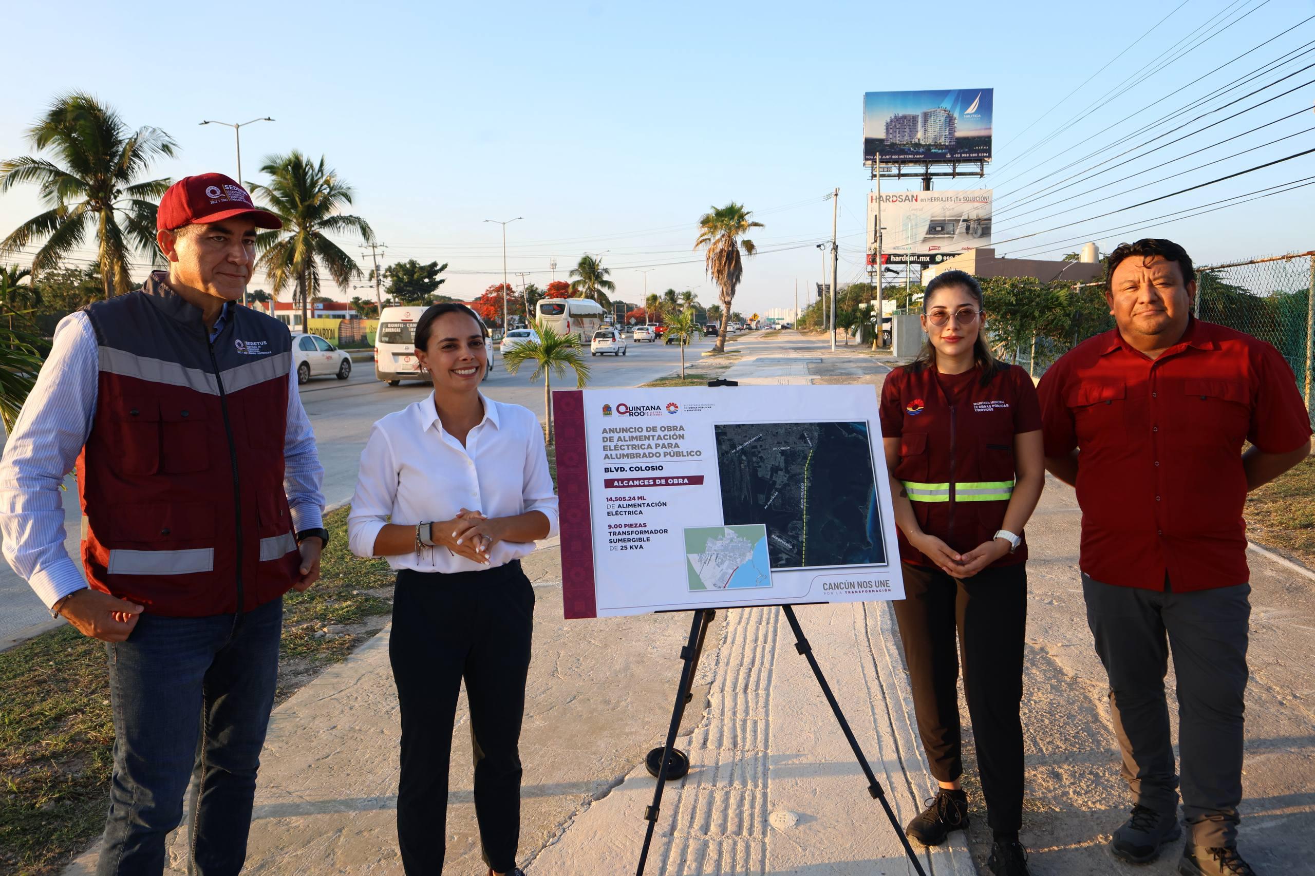 La Presidenta Municipal, Ana Paty Peralta, anunció el inicio de la obra de alimentación eléctrica para el alumbrado público en el Boulevard Luis Donaldo Colosio, un proyecto que contempla 14 mil 505.24 metros lineales de alimentación eléctrica y la instalación de 9 transformadores sumergibles de 25 KVA, como una acción estratégica que forma parte del proyecto integral de modernización de esta vialidad, una de las más importantes de Cancún.