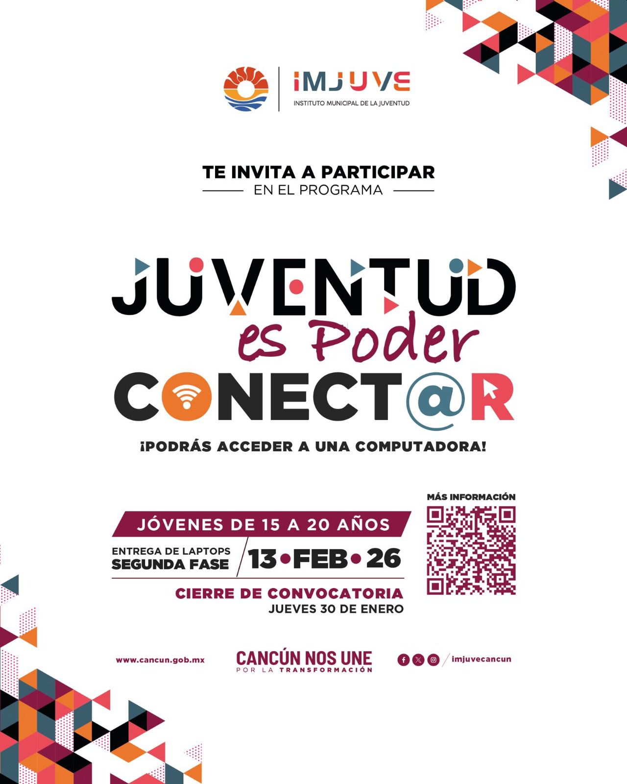 Para mayor información pueden consultar el sitio de cancun.gob.mx/convocatorias, comunicarse al teléfono 998 493 1913, o a través de las redes oficiales del Instituto: @imjuvecancun en Instagram e Imjuve Cancún en Facebook.