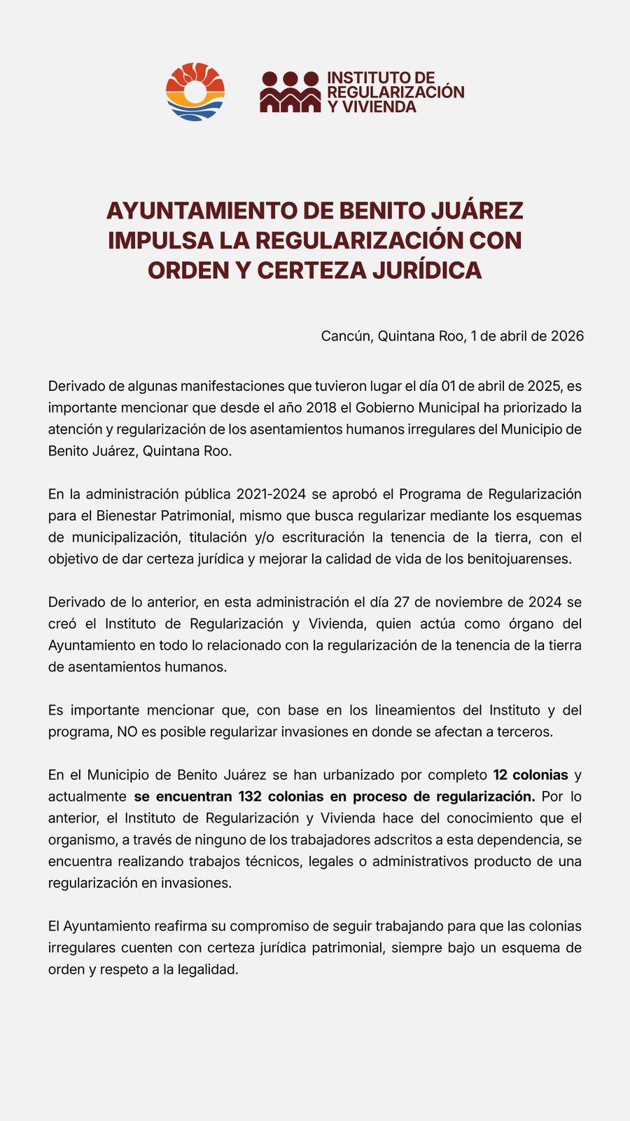 En el Municipio de Benito Juárez se han urbanizado por completo 12 colonias y actualmente se encuentran 132 colonias en proceso de regularización. Por lo anterior, el Instituto de Regularización y Vivienda hace del conocimiento que el organismo, a través de ninguno de los trabajadores adscritos a dicha dependencia, se encuentra realizando trabajos técnicos, legales o administrativos, producto de una regularización en invasiones.