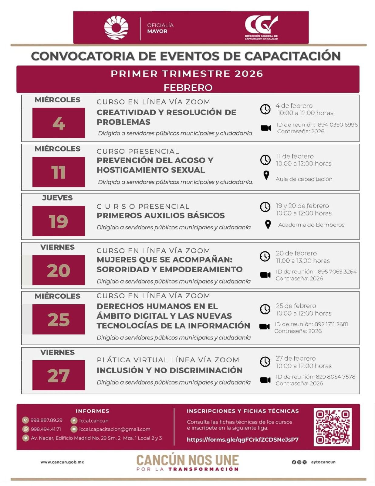 Para inscripciones y fichas, se pide a los interesados entrar a la siguiente liga: https://forms.gle/qgFCrkfZCDSNeJsP7, o pedir informes en los canales oficiales: en el número 998 887 89 29, iccal.cancun en Facebook, [email protected], así como en el WhatsApp: 998 494 41 71.