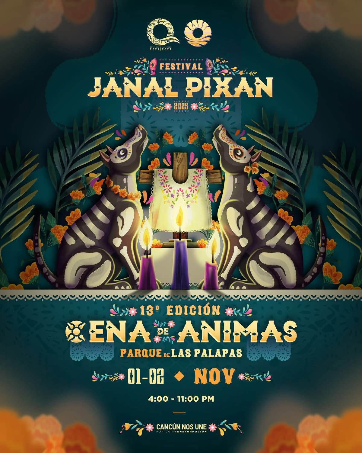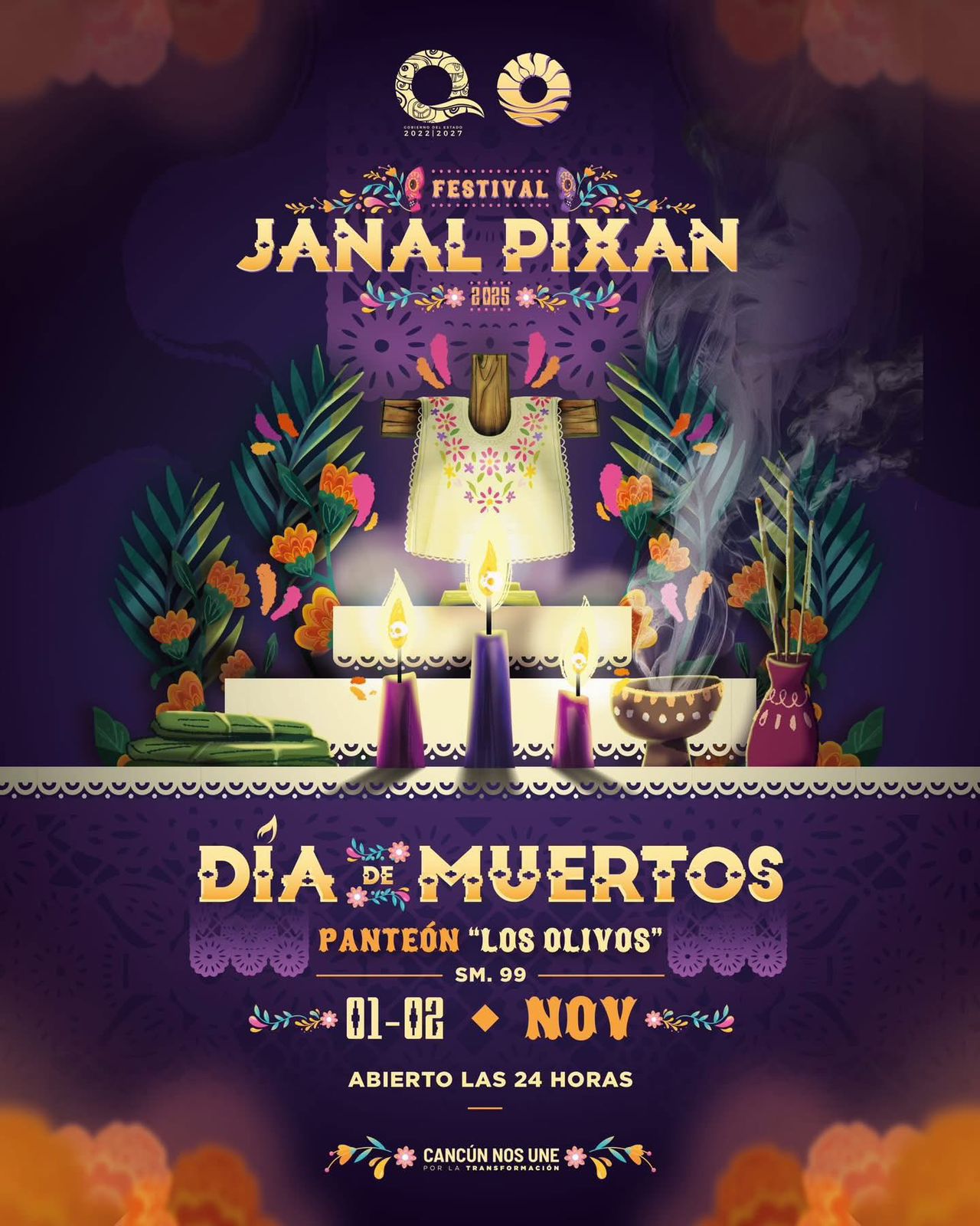 El Ayuntamiento de Benito Juárez, invita a los cancunenses y visitantes a asistir al Festival “Janal Pixan 2025”, a la “Cena de Ánimas” y al “Día de Muertos”, que se llevarán a cabo el 30 y 31 de octubre, así como el 01 y 02 de noviembre en distintos puntos de la ciudad, con un amplio programa cultural, artístico y gastronómico.