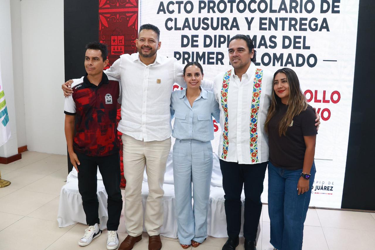 La Presidenta Municipal, Ana Paty Peralta, felicitó a los 19 egresados del primer diplomado de Desarrollo y Gestión del Turismo Deportivo Sustentable, impartido por la Universidad Tecnológica de Cancún (UT), con el fin de formar profesionales capaces de diseñar, planear y gestionar proyectos en esa área para impulsar el sector turístico y deportivo en la región.