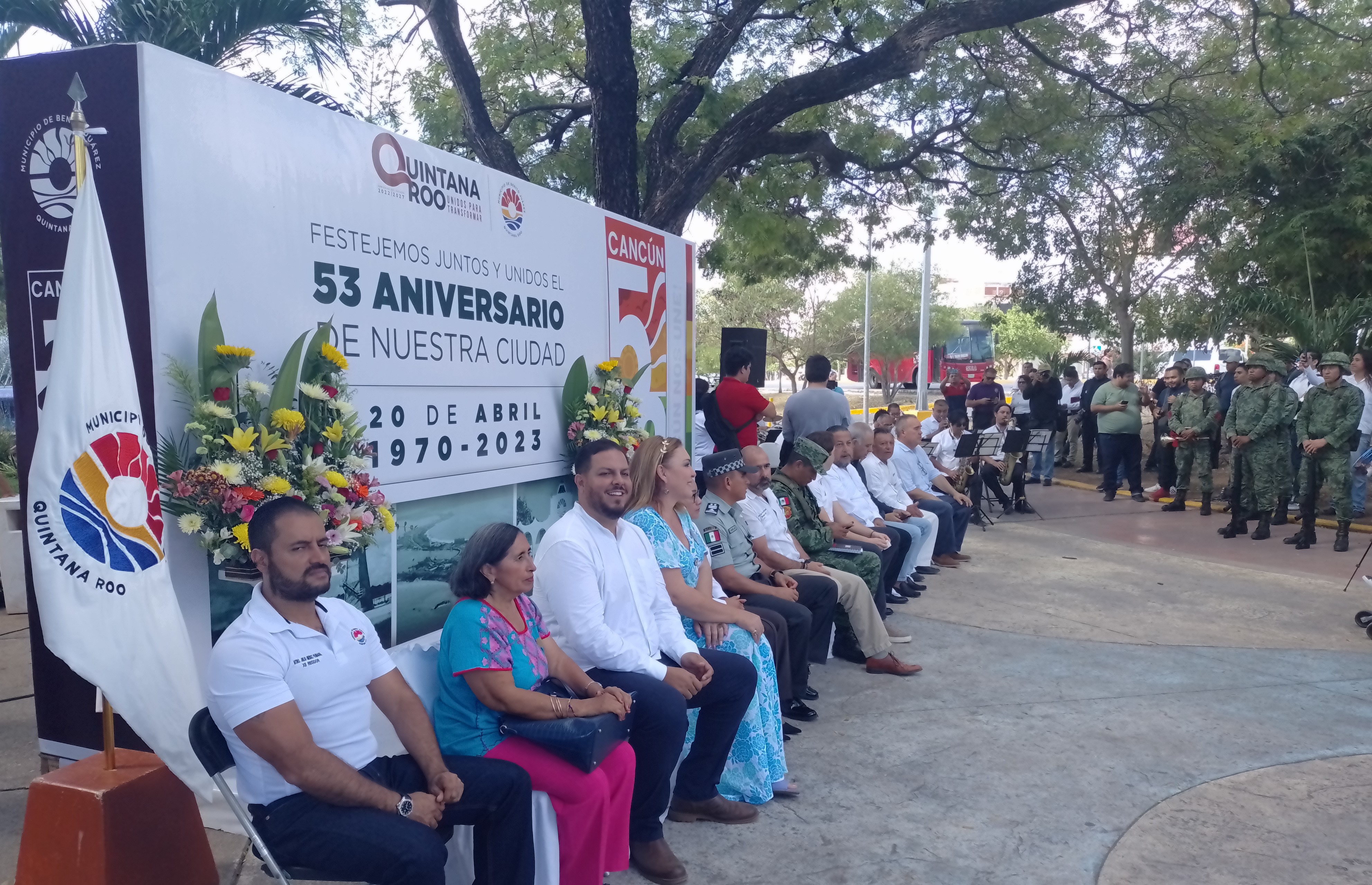 En evento cívico en la Plaza de la Reforma, por el 53 aniversario de Cancún, el secretario del ayuntamiento, Jorge Aguilar, en representación de la alcaldesa Paty de la Peña, exhortó a todos los beniotojuarenses a mejorar las condiciones en la que se encuentra ciudad, de la que está muy orgulloso porque aquí nació hace 46 años