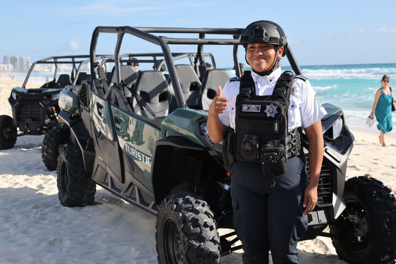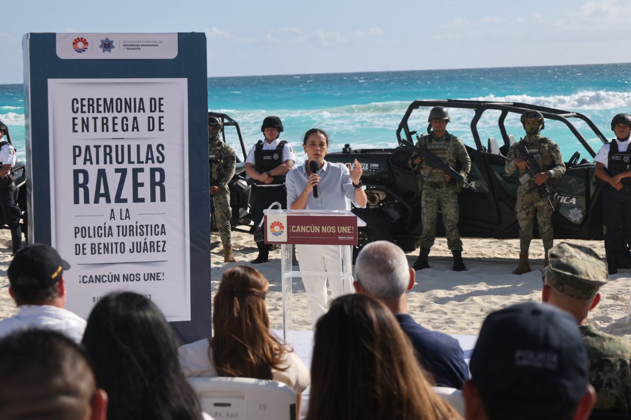 Reitero mi compromiso de seguir dignificando a la Policía del Municipio de Benito Juárez y también dignificando la labor de todas y todos ellos, hoy asumimos con responsabilidad este compromiso, y prueba de ello son los 8 vehículos razers que entregamos para fortalecer las tareas de prevención, monitoreo y la capacidad de respuesta en nuestras playas y comercios de la Zona Hotelera”, aseguró la Presidenta Municipal, Ana Paty Peralta, en la entrega de patrullas Razer a la Policía Turística de este Ayuntamiento con inversión del Derecho de Saneamiento Ambiental.