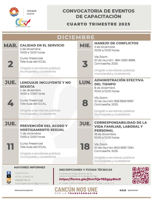 El Ayuntamiento de Benito Juárez, a través del Instituto de Capacitación en Calidad (ICCAL), concluirá este cuarto cuatrimestre del 2025 con el ciclo de eventos de capacitación a partir del martes 02 de diciembre hasta el jueves 18 de este mes, con un amplio y variado contenido de temas de interés general gratuitos para servidores públicos o los ciudadanos interesados.