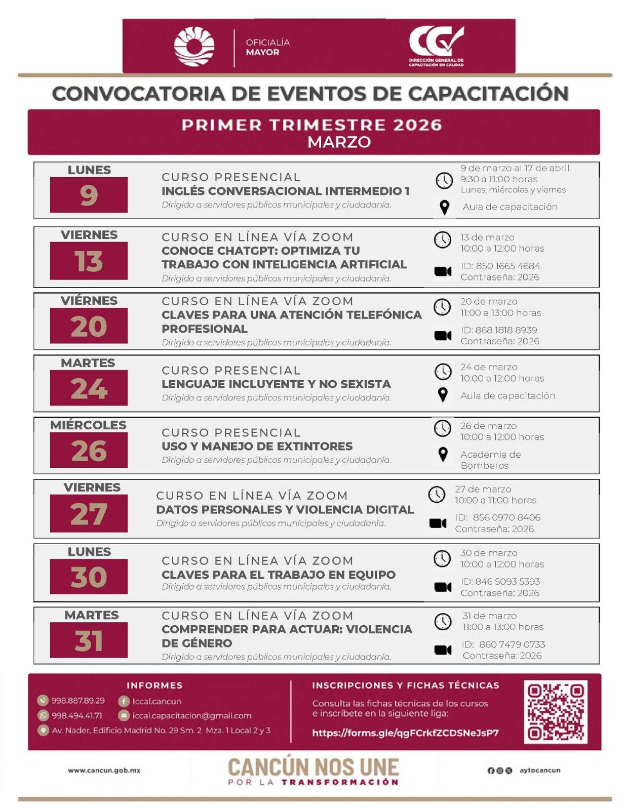 Por otro lado, al ser un segundo lenguaje una herramienta valiosa sobre todo en un destino turístico como Cancún, este lunes 09 de marzo, iniciará el curso presencial “Inglés conversacional Intermedio I”, hasta el 17 de abril en el aula de capacitación de la misma dirección y en el mismo sitio se dará para toda la comunidad, la capacitación sobre: “Uso y manejo de extintores”, el próximo miércoles 26 de marzo, de 10:00 a 12:00 horas.
