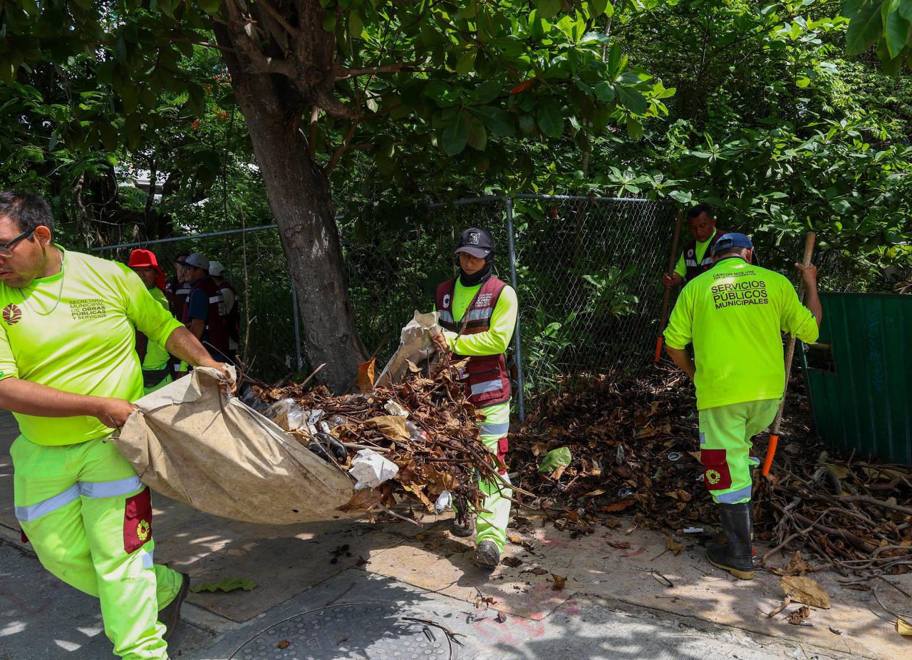 Los trabajos se efectuaron entre la Av. Sayil y la Av. Uxmal, en un tramo de cuatro kilómetros, donde más de 20 elementos llevaron a cabo la limpieza general en las calles y avenidas con barrido fino, pepena, limpieza de guarniciones y banquetas, poda de árboles, así como retiro de basura vegetal y orgánica.