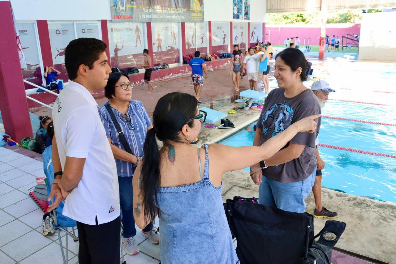 Luego de realizar un recorrido de supervisión en las instalaciones de la Alberca Semiolímpica del Gimnasio “Nohoch Suku’n”, en Chetumal, Jacobo Arzate Hop, presidente de la Comisión del Deporte de Quintana Roo (CODEQ), platicó y escuchó a un grupo de madres de familia de atletas y usuarios, quienes expresaron sus solicitudes para brindar mantenimiento menor al espacio deportivo, mismos que fueron atendidos de manera inmediata.