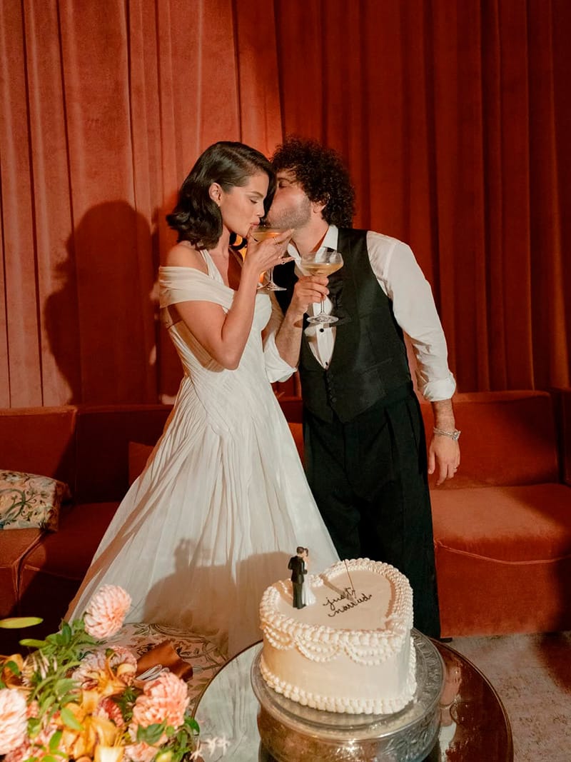 En una de las imágenes compartidas, ambas aparecen abrazadas bajo un techo cubierto de luces doradas, con Taylor dándole un beso en la mejilla a Selena. Ella, con un vestido blanco brillante y labios rojos, sonríe con los ojos cerrados, mientras Taylor luce un elegante vestido negro con escote palabra de honor.