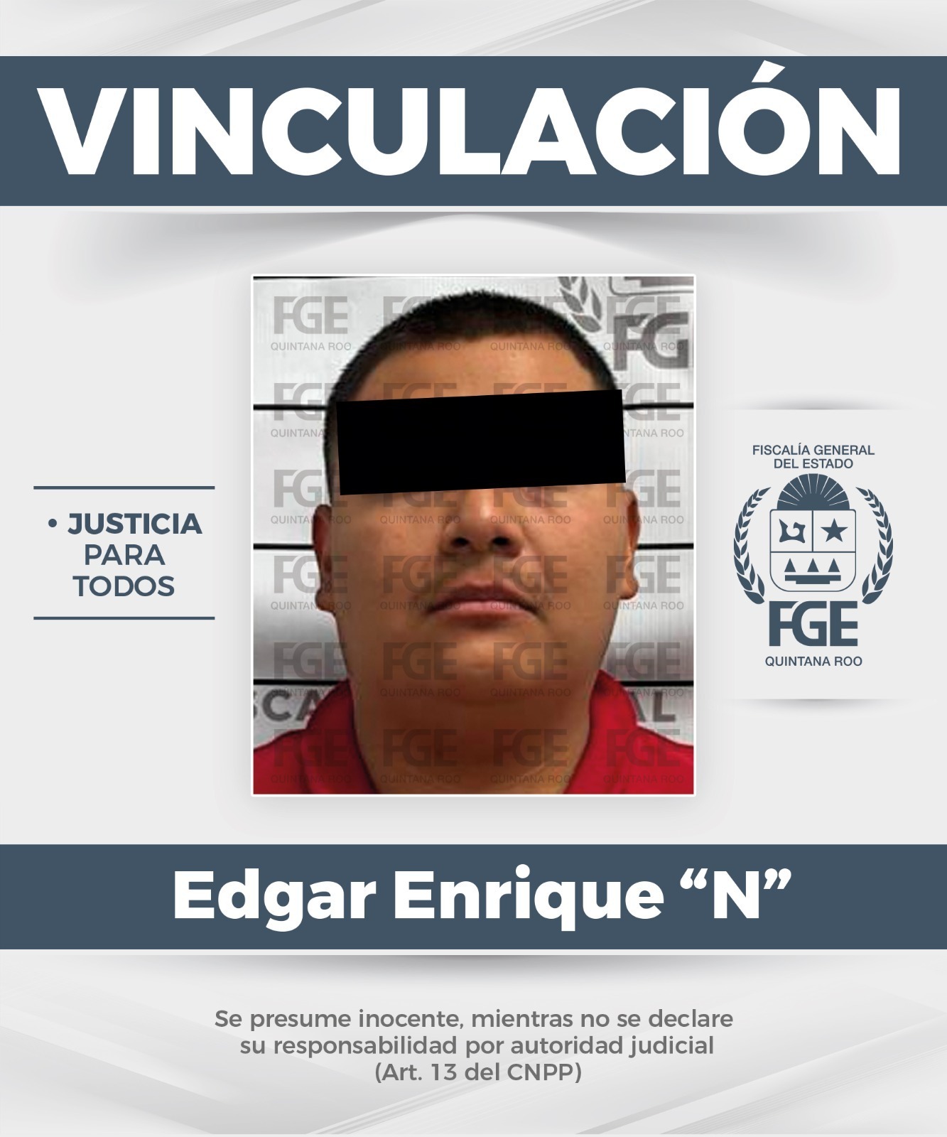 La Fiscalía General del Estado informa que, tras la aportación de datos de prueba, obtuvo de un Juez de Control el auto de vinculación a proceso contra Edgar Enrique “N”, por su presunta relación en hechos probablemente constitutivos del delito de homicidio calificado en agravio de una víctima de identidad reservada.