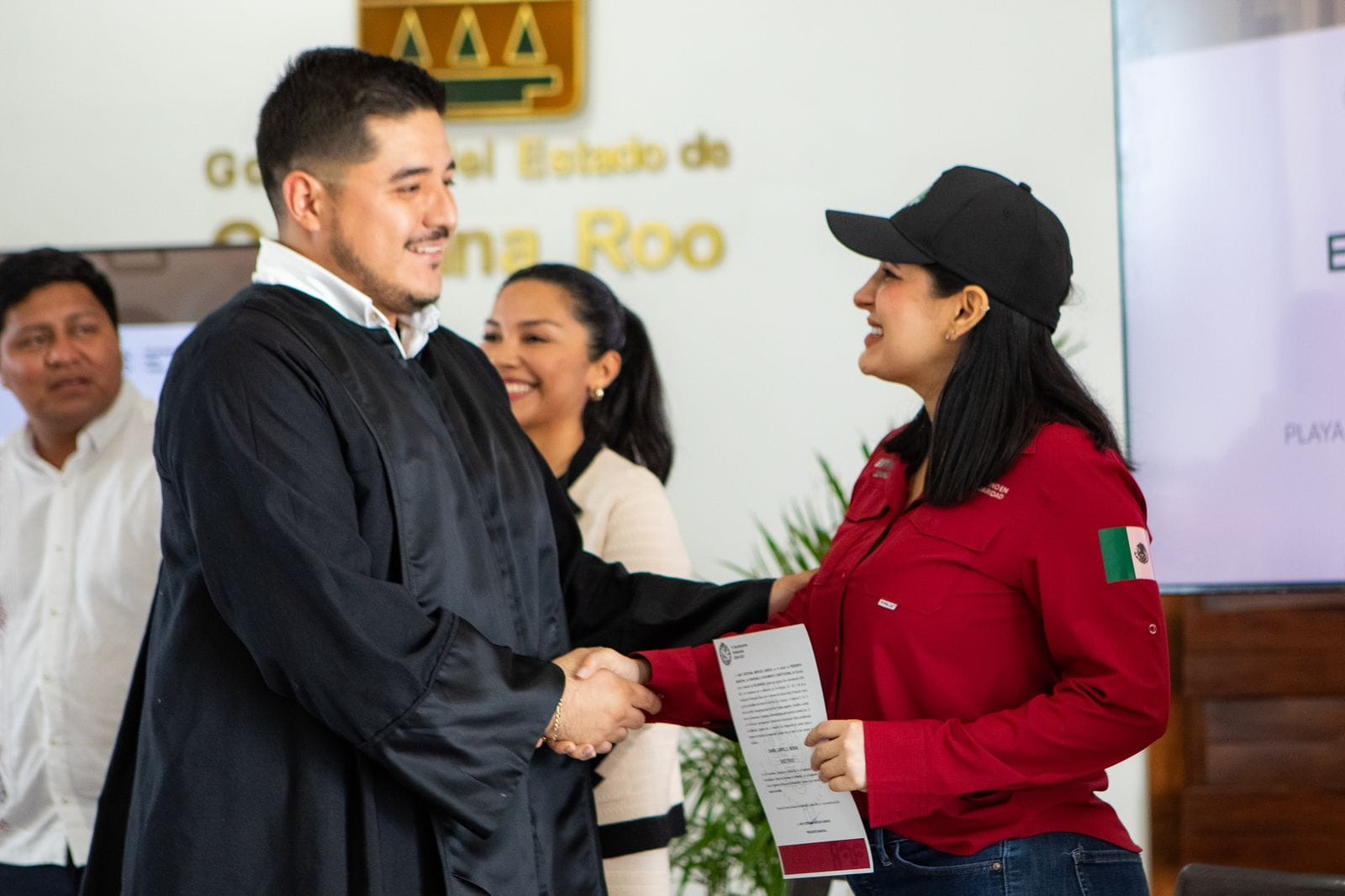 La Justicia Cívica es la herramienta clave para prevenir conflictos, fortalecer el tejido social y construir un Solidaridad más justo y ordenado, dijo la presidenta municipal Estefanía Mercado, en la entrega de siete nombramientos a juezas y jueces cívicos, en el salón “Leona Vicario”, en el nuevo Palacio Municipal.