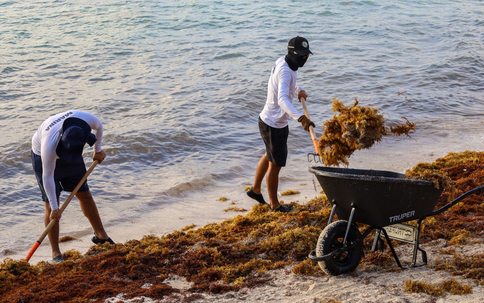 La alcaldesa informó que en estas labores participaron 50 trabajadores de la Secretaría de Medio Ambiente, Bienestar Animal y Movilidad Sustentable, así como de Zona Federal Marítimo Terrestre (Zofemat), quienes desde temprana hora iniciaron las acciones de recolección del alga en la franja costera del municipio. A estas tareas también se sumaron 20 elementos de la Secretaría de Marina, quienes apoyan en el retiro y manejo del sargazo.