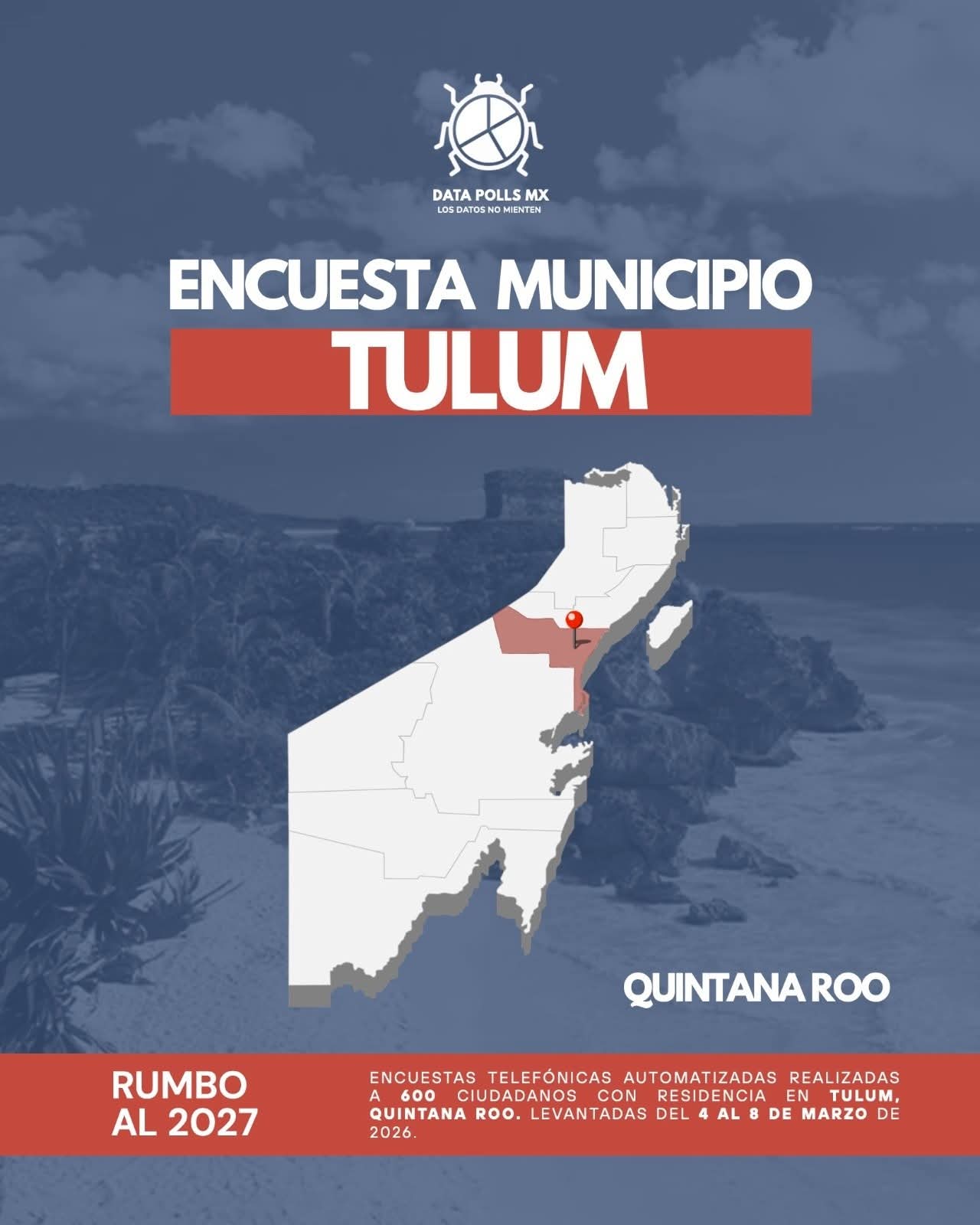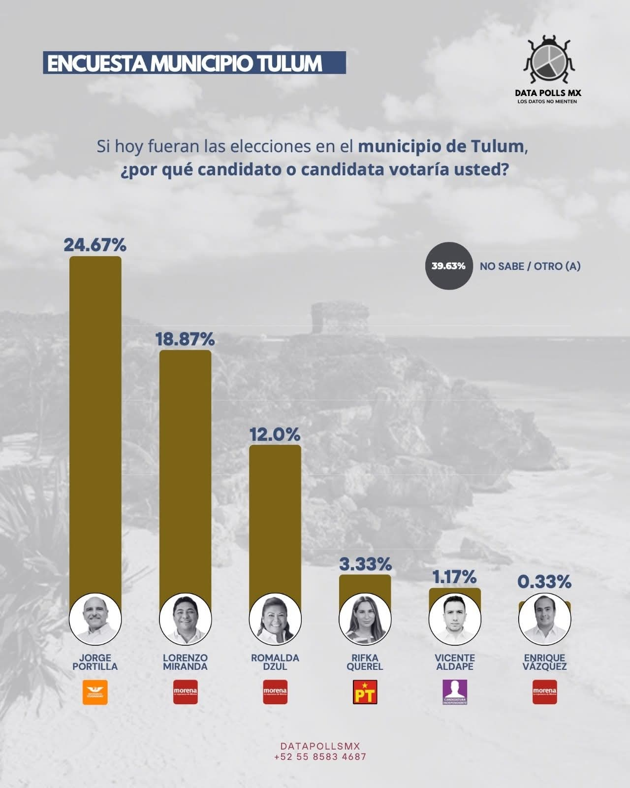 De acuerdo con el más reciente estudio de opinión pública de la casa Data Polls MX, Jorge Portilla Mánica, de Movimiento Ciudadano, lidera actualmente la intención de voto a la presidencia municipal de Tulum con 24.67%. Sin embargo, el análisis destaca un avance significativo de Lorenzo Miranda, quien se posiciona no solo en el segundo lugar general con un 18.87%, sino como el candidato mejor ubicado y con mayor viabilidad competitiva dentro de Morena.